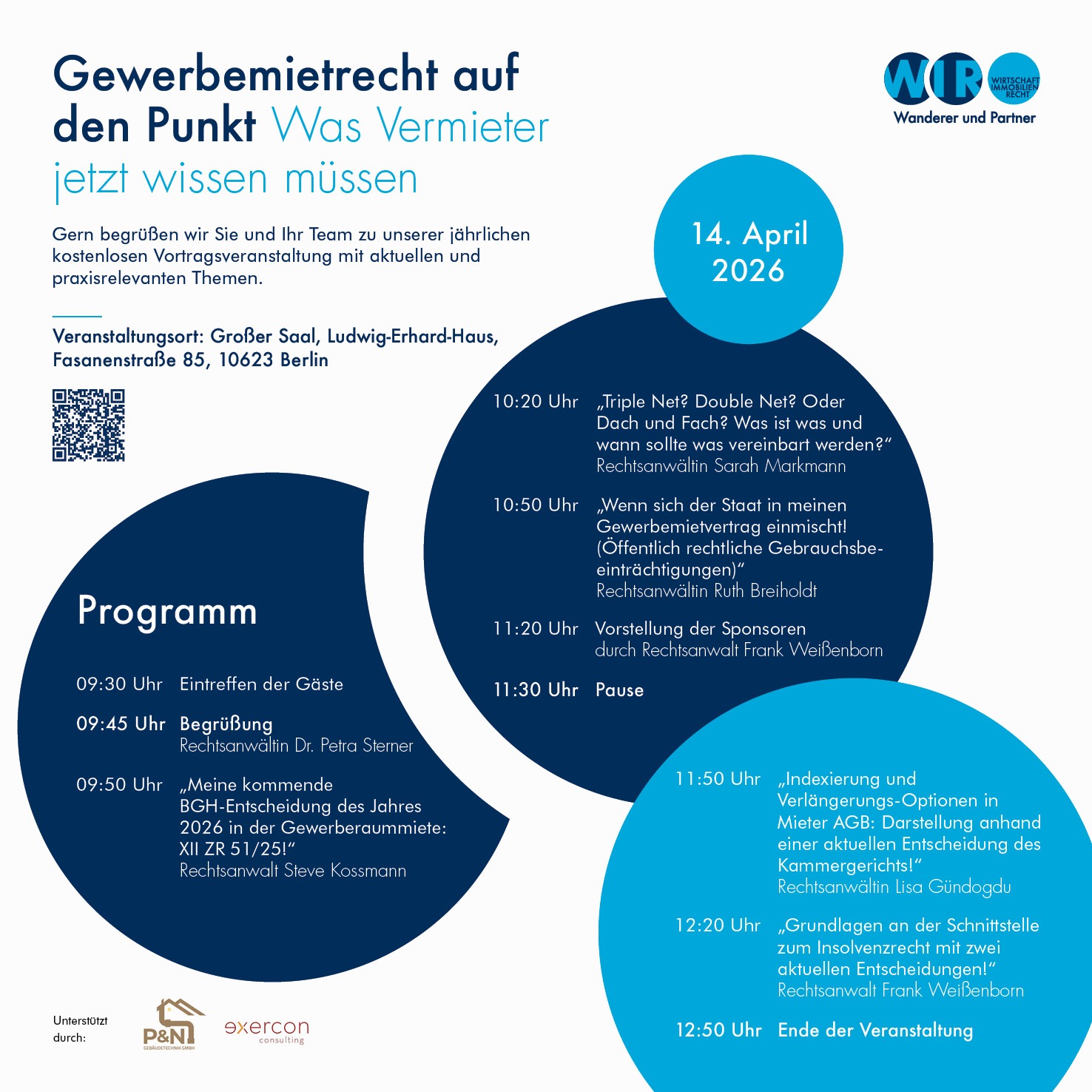 Termin: 14. April 2026Gewerbemietrecht auf den Punkt: 09.45 - 13.00 UhrVeranstaltungsort: Ludwig-Erhard-Haus, Fasanenstraße 85, 10623 BerlinVeranstalter: WIR Wanderer und Partner Rechtsanwältinnen und Rechtsanwälte